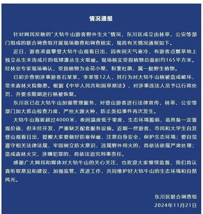 近日,有网友拍摄到,部分登山者为了取暖,在大牯牛山上砍伐树枝烧火。云南省昆明市东川区聚拢拜谒组发布通报称,有搭客点火草地上孤独丛生未连成片的低矮灌丛生火取暖,现场核实受损植物总面积约165经常米,“对涉事犯法东说念主员给以行政处罚,并条款限期进行植被收复”。